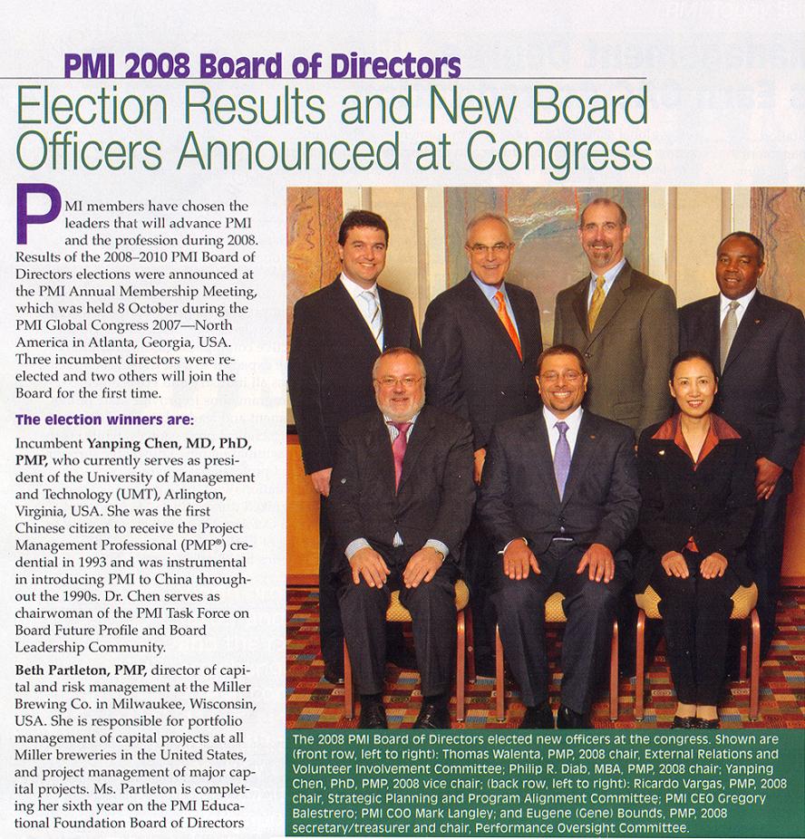 Dr. Yanping Chen has been elected Vice Chair of the Project Management Institute (PMI) for 2008. She has been a Director-at-Large on the 15-person PMI Board of Directors — representing over 250,000 PMI members in 171 counties — since 2005 and is currently serving her second term, which is from 2008 to 2010.