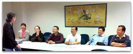 Left to right: UMT President, Dr. Yanping Chen (standing), Yuwen Zhang, Yongfang Deng, Minjia Huang, Zihua Zheng, Weihua Zhang, Weifeng Lin.